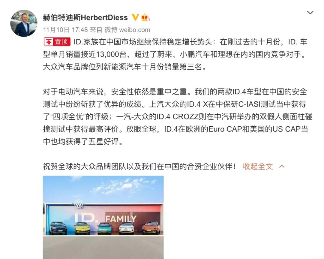 據(jù)了解,大眾旗下的德國工廠有茨維考工廠和德累斯頓工廠。而茨維考工廠主要負(fù)責(zé)生產(chǎn)大眾ID.3、ID.4、奧迪Q4 e-tron和Cupra Born等車型。值得注意的是,早幾日,大眾汽車集團(tuán)迪斯在社交平臺(tái)發(fā)文表示,ID.家族在中國市場繼續(xù)保持穩(wěn)定增長勢(shì)頭,十月ID.車型單月銷量為12376臺(tái),超過蔚來、小鵬汽車和理想等國內(nèi)競爭對(duì)手。不能看出此次停產(chǎn),也將導(dǎo)致這些車輛供應(yīng)在短時(shí)間內(nèi)受到限制。
