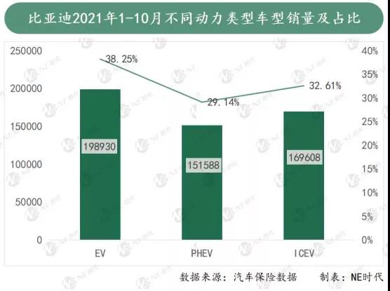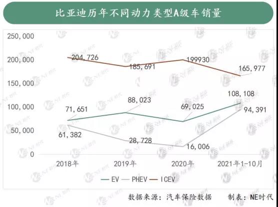 今年前十個(gè)月,比亞迪52萬新車銷量中,EV、PHEV、ICEV分別占比38.25%29.14%32.61%,這應(yīng)該是目前體量最大,電動化程度最高的車企。 從歷年數(shù)據(jù)來看,比亞迪除了電動化程度越來越高,APHEV車型今年的增長速度也非常驚人,相較于去年全年,增長近5倍。相比之下,同級別的燃油車卻出現(xiàn)了下滑。