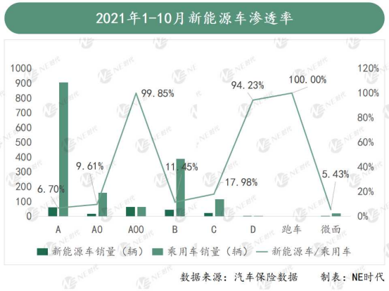 據(jù)汽車保險(xiǎn)數(shù)據(jù)顯示,目前整個(gè)乘用車市場以A、B、A0、C、A00級車為主。 以今年前十個(gè)月的銷量來看,這些主流級別車型中,新能源車滲透率最高的還是A00級車型,其他級別車型的電動化替代空間基本都在90%以上。A級車作為乘用車市場體量最大的一部分,也是目前電動化轉(zhuǎn)型壓力最大的一個(gè)市場。