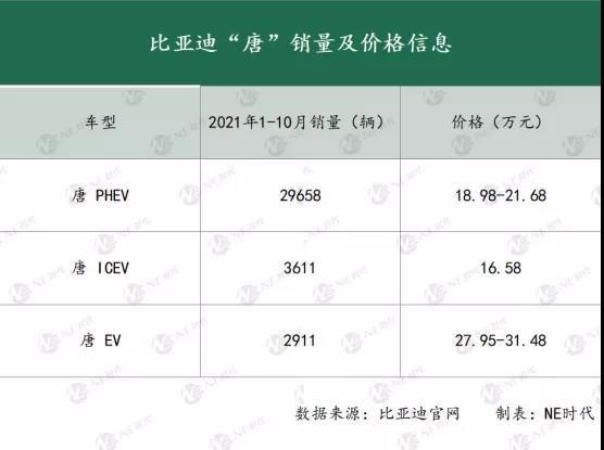 還有一款比較典型的就是宋Plus,插混版前十個(gè)月銷量比燃油版還多出將近900臺。前者價(jià)格區(qū)間在14.68-19.98萬元,后者11.58-14.38萬元之間,就汽車保險(xiǎn)數(shù)據(jù)來看,插混版本主要起量的是14-16萬之間的這兩款,這跟燃油版的高配版差價(jià)非常小,所以在價(jià)格上還是非常有優(yōu)勢的。 不僅是A級車,在比亞迪體系里面,B級車唐PHEV低配版與燃油版車型價(jià)差也拉得很近,并且以高性價(jià)比完勝EV版銷量。