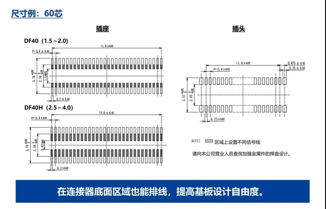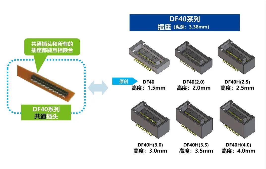 特點 1. 省空間:縱深3.38mm 2. 堆疊高度 1.5-4.0mm 3. 對應USB4 Gen.2(10Gbps)信號傳輸 *1 4. 有效嵌合長度長:0.45mm 5. 卓越的端子構造實現(xiàn)了明確的鎖扣手感以及大嵌合力 6. 防止端子變形構造 7. 種類繁多(帶護罩:DF40G系列,帶完全鎖:DF40GL系列,ADAS:DF40T系列) 8.核心數(shù)量從10到120核心變化巨大 9.用導向肋確保自動對準:0.33mm 10.防止鎳阻擋層焊接的結構 11.還提供用于生產(chǎn)線檢查的高度耐用的連接器* 只有H=1.5 mm的產(chǎn)品支持Type-C DF40系列變體