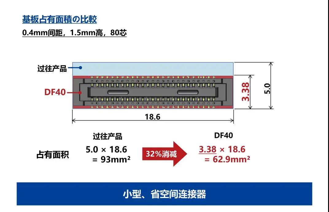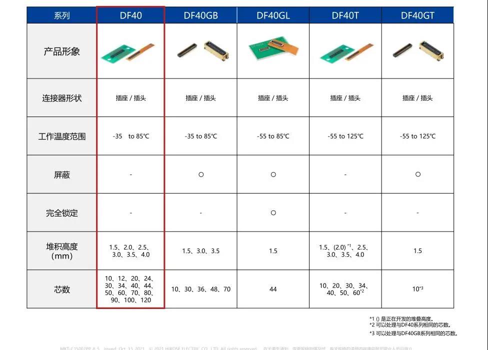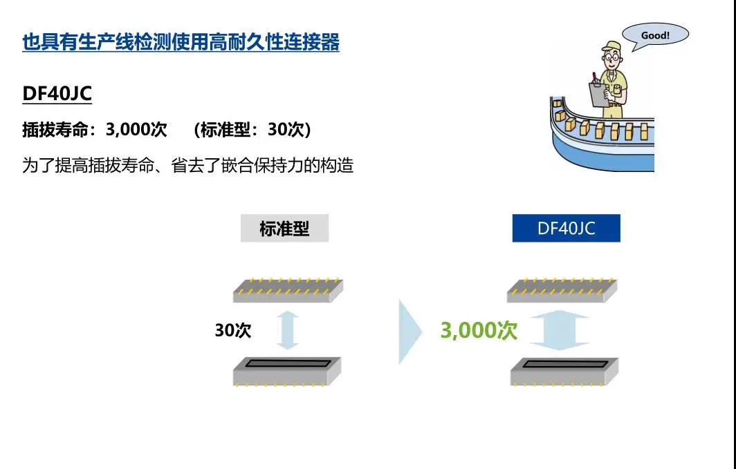 7. 種類繁多(帶護罩:DF40G系列,帶完全鎖:DF40GL系列,ADAS:DF40T系列) 8.核心數(shù)量從10到120核心變化巨大 9.用導向肋確保自動對準:0.33mm 10.防止鎳阻擋層焊接的結構 11.還提供用于生產(chǎn)線檢查的高度耐用的連接器* 只有H=1.5 mm的產(chǎn)品支持Type-C