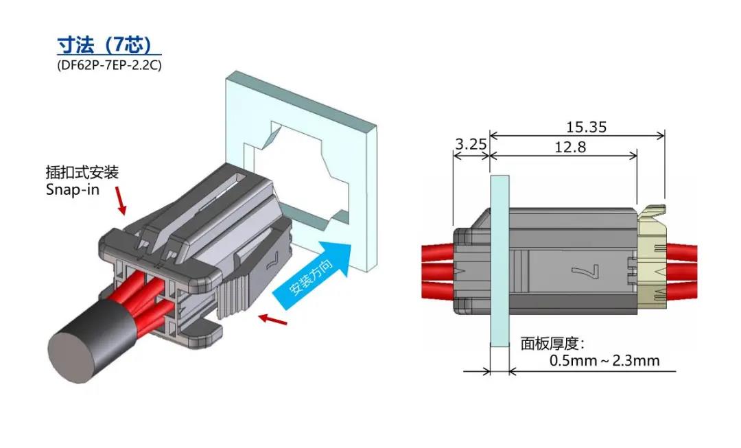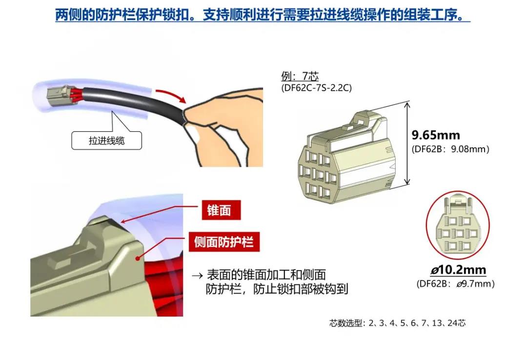 特點 [SignalBee?] 2 x 2.2 mm間距 用于狹小空間纖細型中繼連接器(UL C-UL認證產品) 1. 纖細光滑的外形適合狹窄空間的布線 2. 清晰的鎖扣感和目視可確認是否鎖定 3. 可靠的接觸結構 4. 堅固的端子結構 5. 芯數(shù)選型:2、3、4、5、6、7、13、24 DF62B:標準型 DF62C:鎖加部保護強化型 DF62P:面板安裝型 6. 可與DF11/DF59系列共用自動壓著設備 7. 防冷凝措施(防水型DF62W) 細小