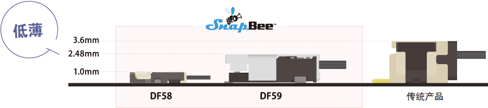 支持28 AWG,高度1.0mm,是業(yè)內(nèi)最低薄級別的小型連接器。DF58系列是SnapBee中在低薄構(gòu)造和窄間距方面最具優(yōu)勢的產(chǎn)品,有助于實現(xiàn)機器設(shè)備的小型化。較大的有效嵌合長度可以實現(xiàn)穩(wěn)定的連接。